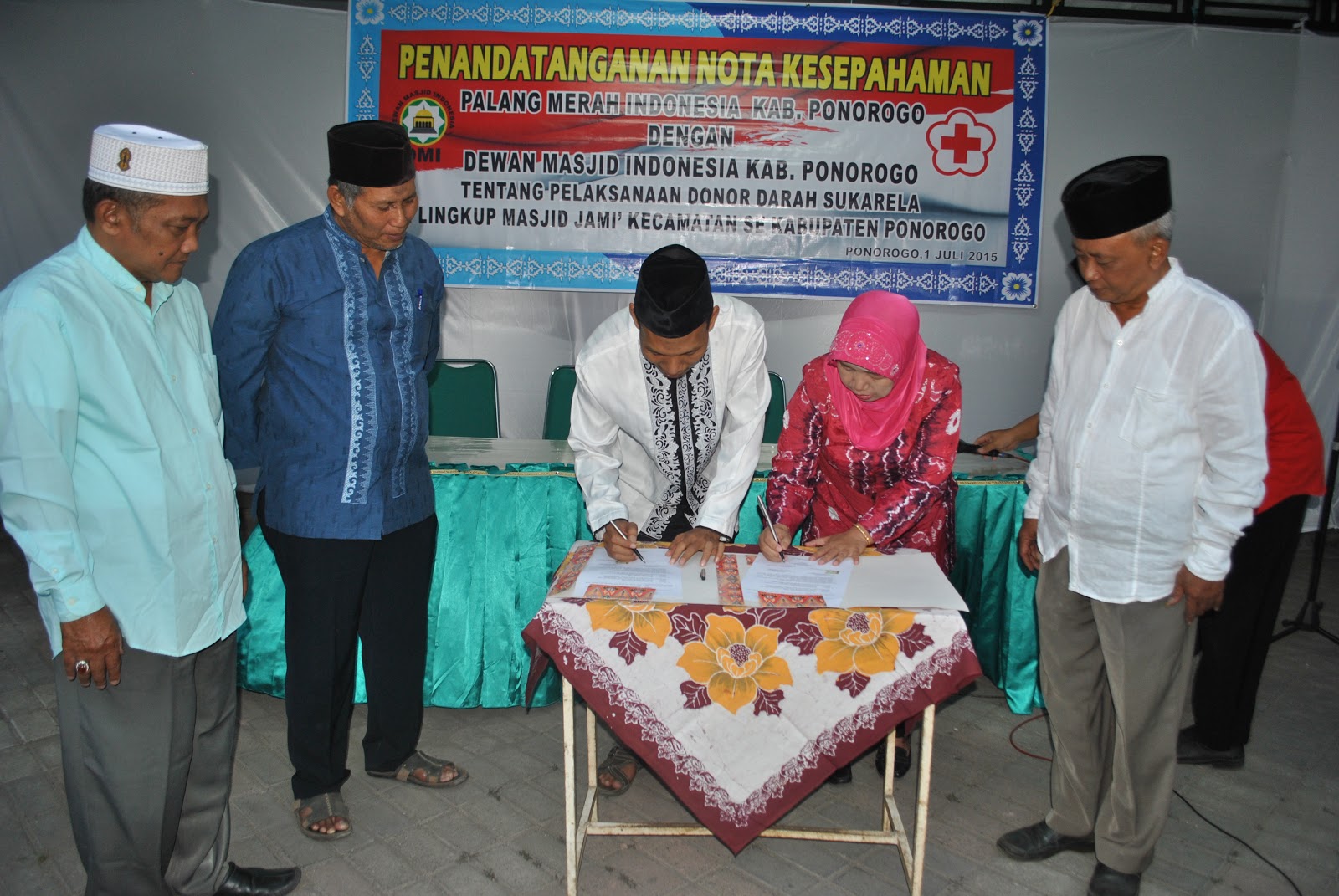 CERITARELAWAN.ID, Ponorogo - Dalam rangka memenuhi meningkatnya Kebutuhan darah dan untuk meningkatkan pelayanan kepada masyarakat Kabupaten ponorogo, PMI Kabupaten Ponorogo mengadakan Penandatangan Nota Kesepahaman dengan Dewan Masjid Indonesia Kabupaten Ponorogo Tentang Donor Darah Sukarela pada tanggal 1 Juli 2015 bertempat di Halaman Gedung PMI Kabupaten Ponorogo Jl. Dr. Soetomo No. 7 – 9 Ponorogo.