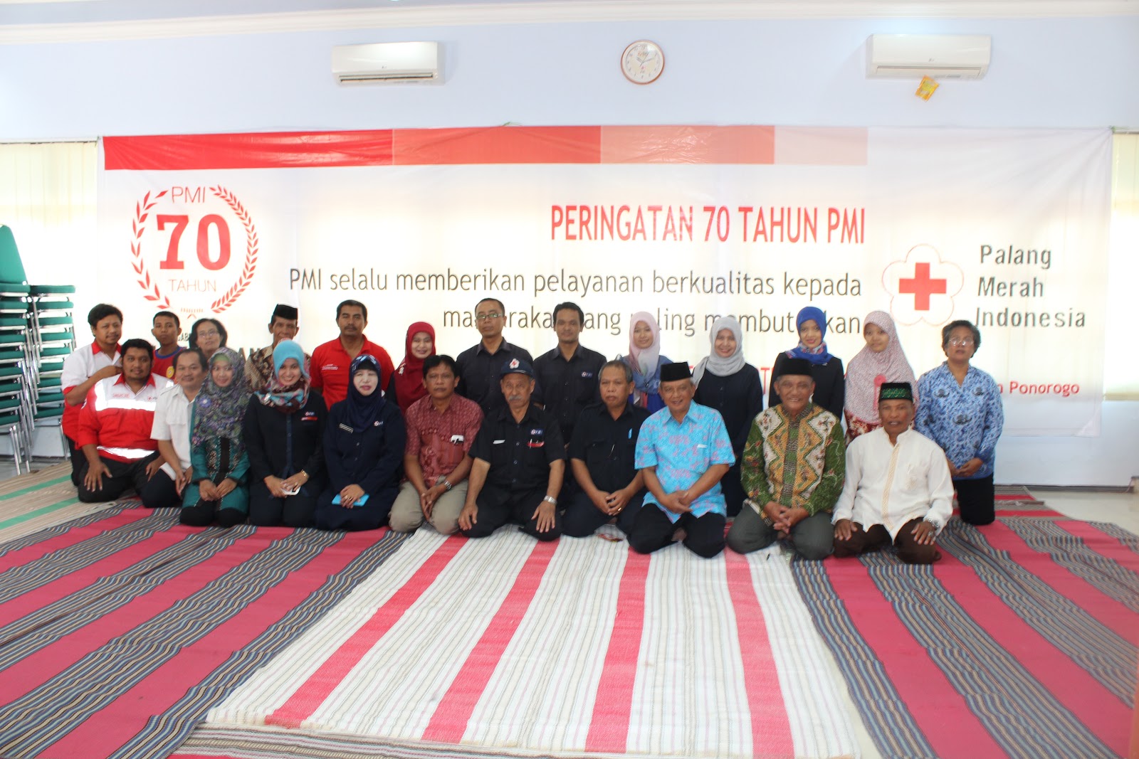 Menyambut HUT PMI ke 70, PMI Kabupaten Ponorogo mengadakan tasyakuran dihadiri oleh relawan staf dan pengurus bertempat di aula PMI Kabupaten Ponorogo pada tanggal 17 September 2015.