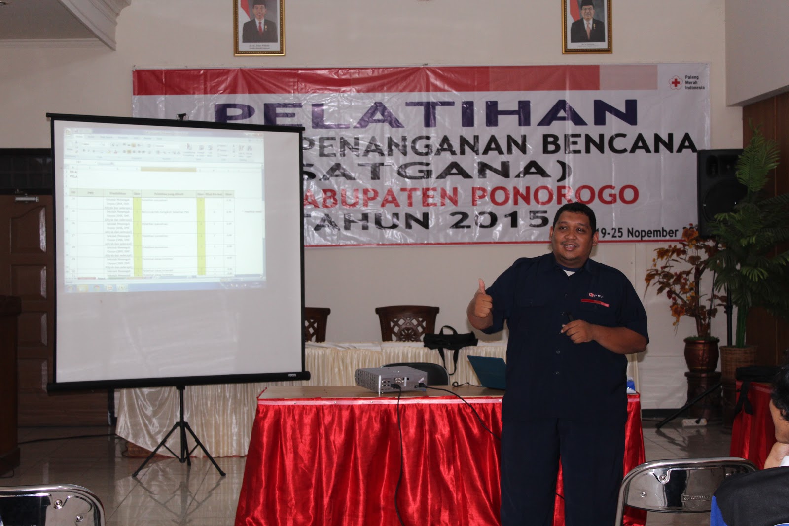 Sukadi Ketua Panitia Mengatakan “ bahwa, acara ini bertujuan untuk meratakan kemampuan dan penguatan kapasitas organisasi serta untuk merapatkan barisan dalam menghadapi bencana meliputi Pra Bencana, Saat Bencana dan Paska Bencana, Pemateri dalam kegiatan ini Fasilitator dari PMI Provinsi Jawa Timur, acara di ikuti oleh 30 orang peserta yaitu KSR-PMI Unit Markas PMI Kabupaten Ponorogo 11 orang peserta, KSR - PMI Unit STAIN Ponorogo 3 orang , KSR - PMI Unit STIKES Buana Husada Ponorogo 2 orang, Kecamatan Ngebel 1 orang, Kecamatan Ngrayun 1 orang, Kecamatan Balong 1 orang, Kecamatan Sawoo 1 orang, Kecamatan Pulung 1 orang, Kecamatan Jenangan 1 orang, Kecamatan Slahung 1 orang, Kecamatan Ponorogo 1 orang,Polres Ponorogo 2 orang, Kodim 0802 Ponorogo 2 orang dan BPBD Kabupaten Ponorogo 2 orang.”
